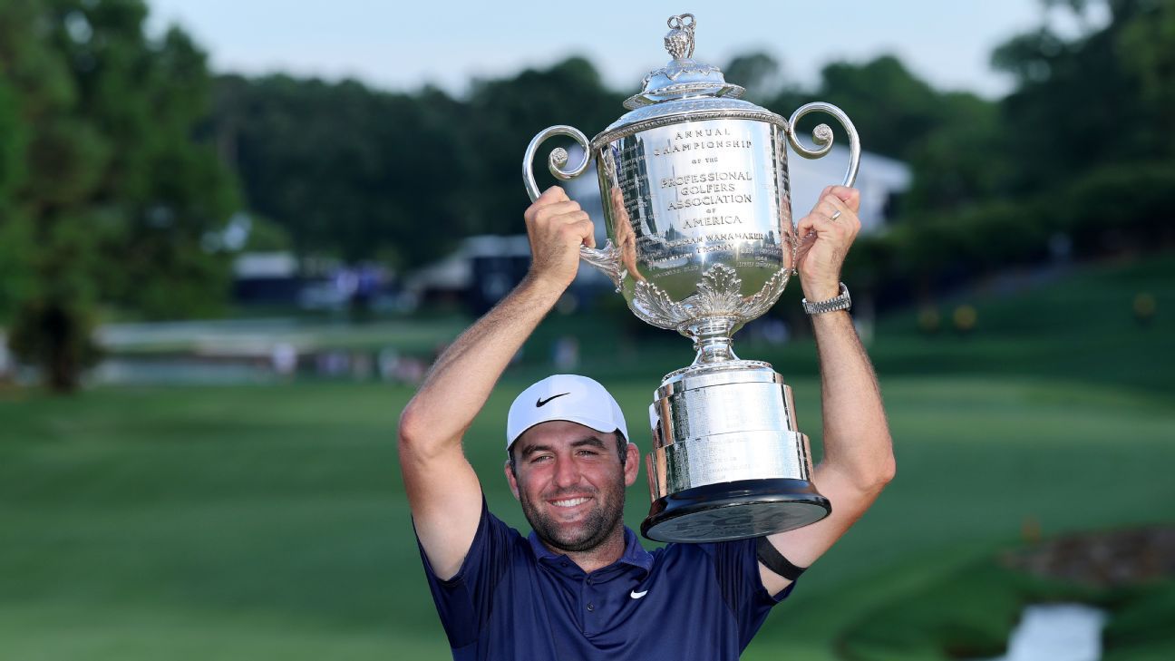 Scheffler posted an even-par 71 in the final round of the 107th PGA Championship for a five-stroke victory over Harris English, Bryson DeChambeau and Davis Riley. What had seemed inevitable at the start of the day began to slip away, at least for a brief moment, as Scheffler made the turn and was tied with Spain’s Jon Rahm on a sweltering, humid afternoon.